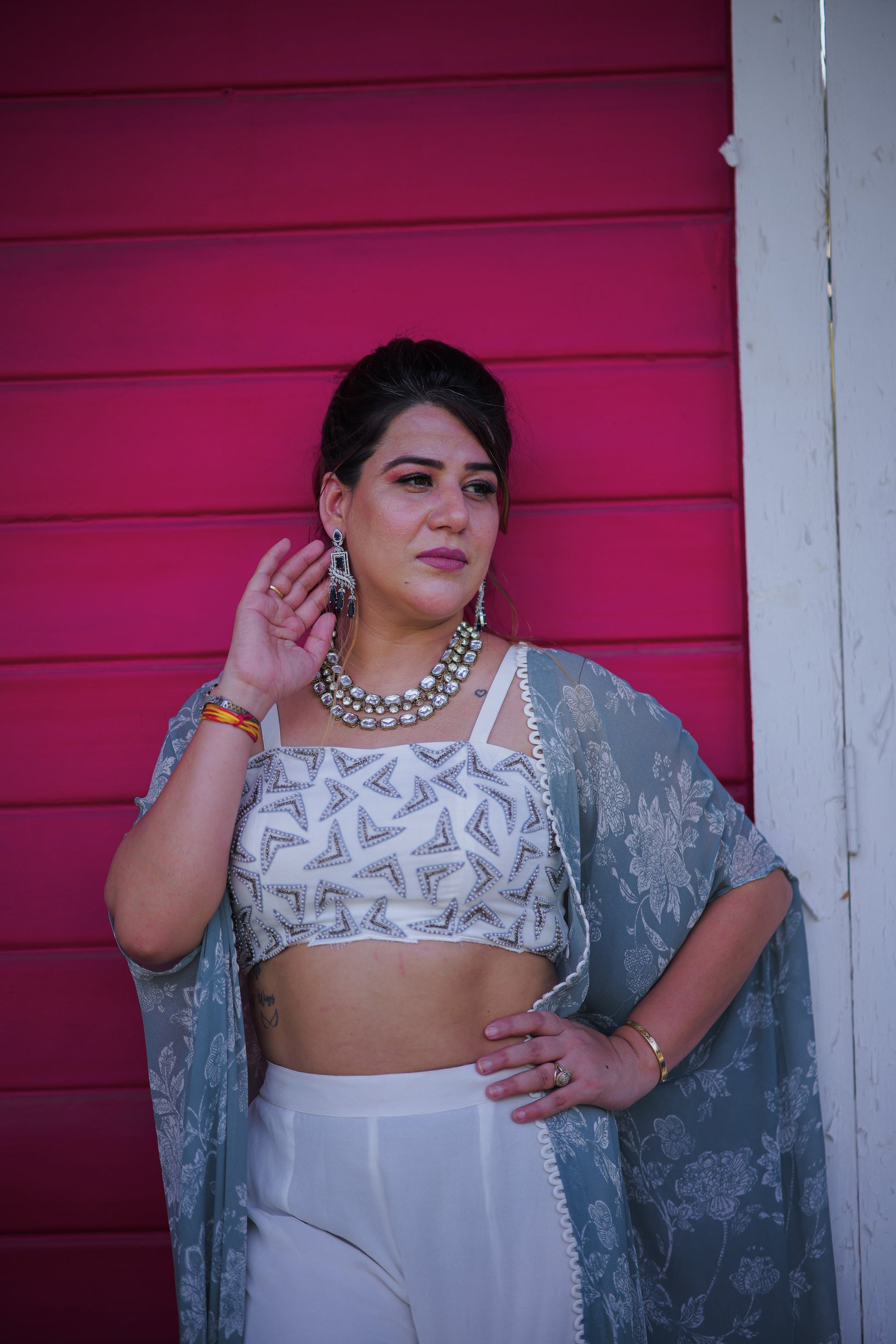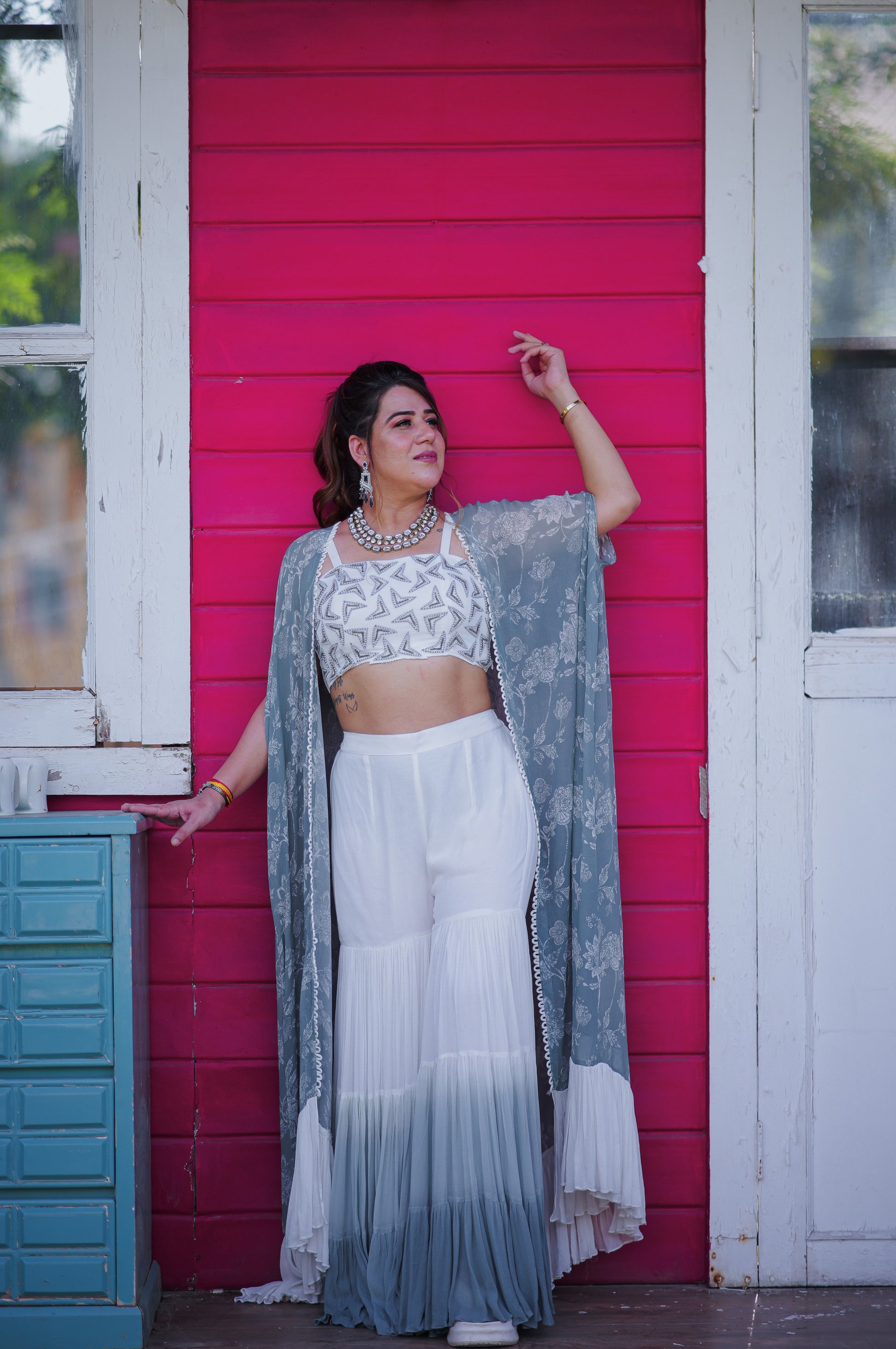 Bottoms: Wide-legged ombré sharara pants in shades of white to grey-blue, with tiered pleats for added volume.