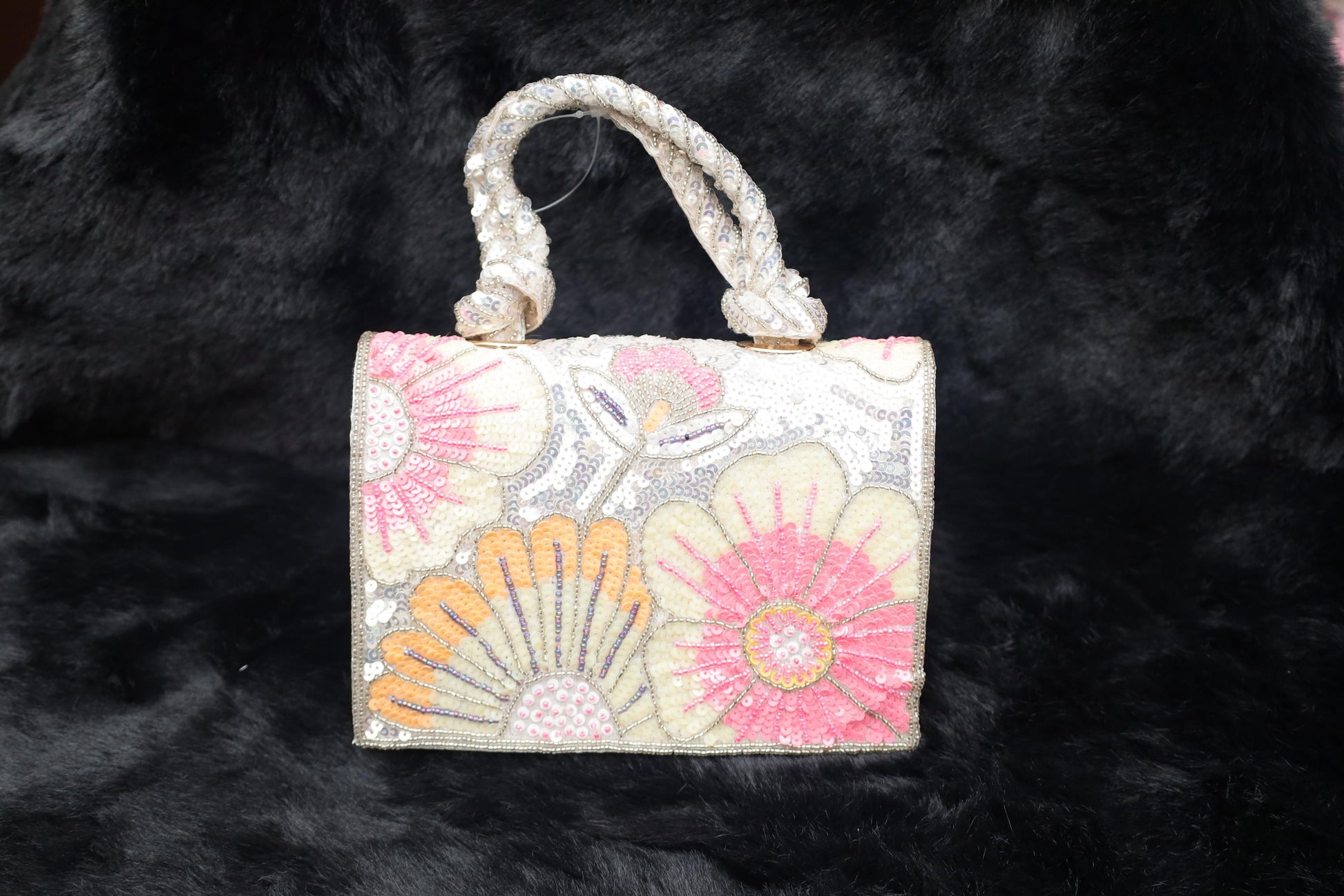 A vibrant box-style handbag that celebrates floral beauty with bold embroidered blossoms. Adorned with sequins and beadwork, this bag is both playful and glamorous. The structured design with sturdy handles makes it a perfect blend of style and function. Product Details: