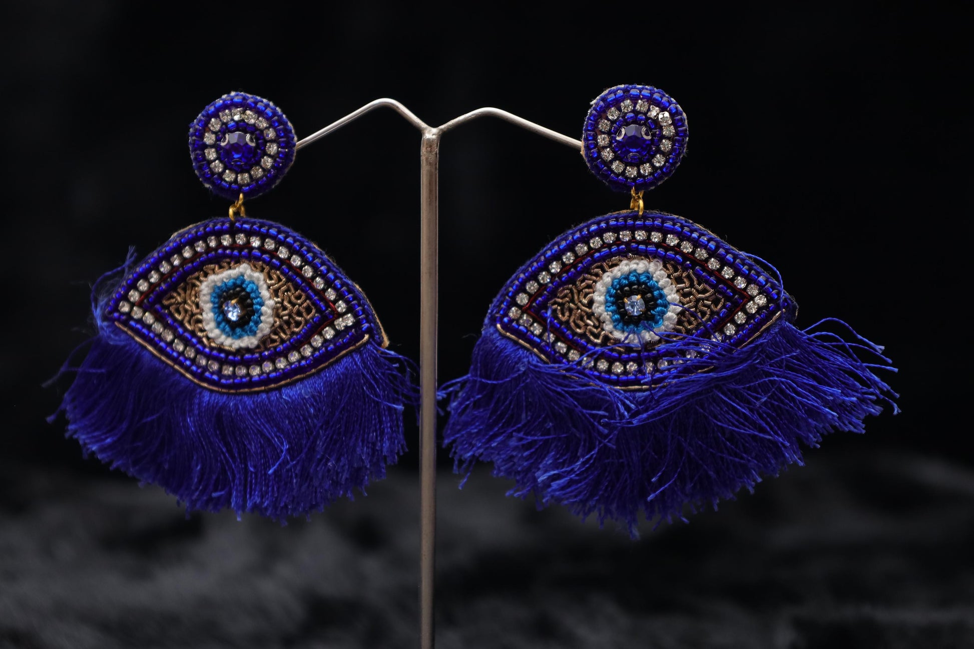 Make a striking style statement with these handcrafted Evil Eye fringe earrings, designed to captivate attention while offering a touch of mystic charm. Featuring the iconic evil eye motif embroidered in vibrant blue, black, and white threads, these earrings are embellished with shimmering rhinestones for extra sparkle and drama.