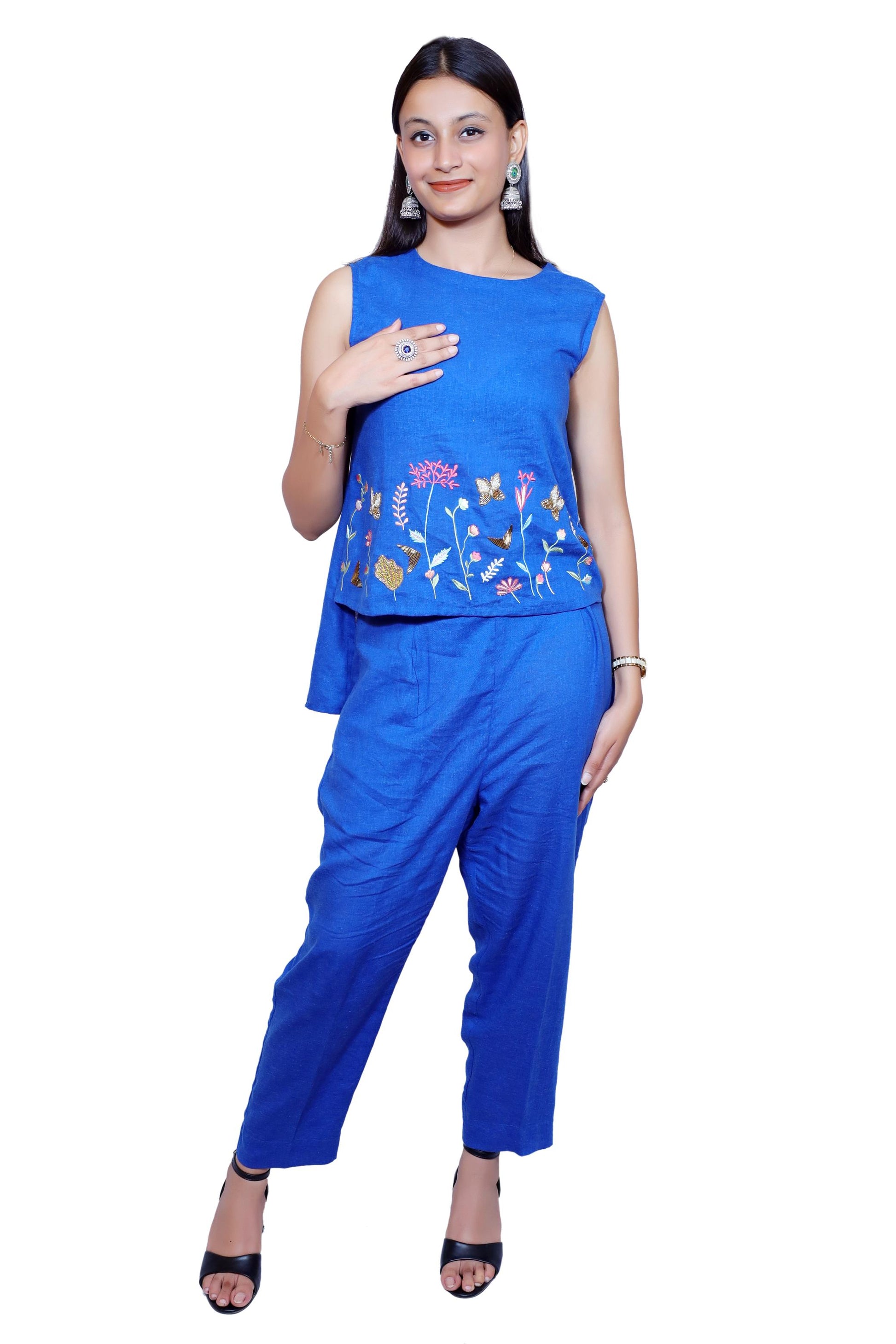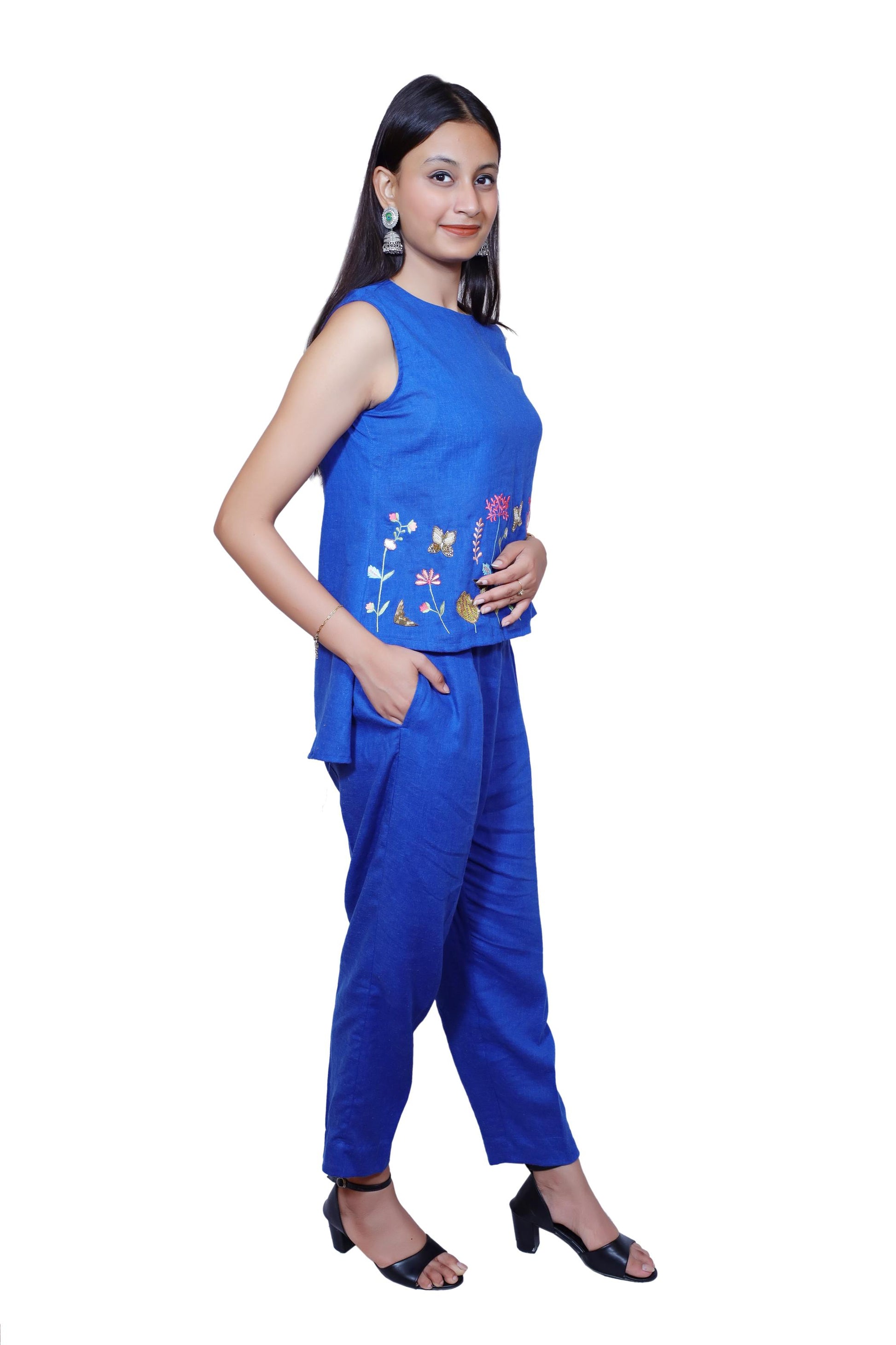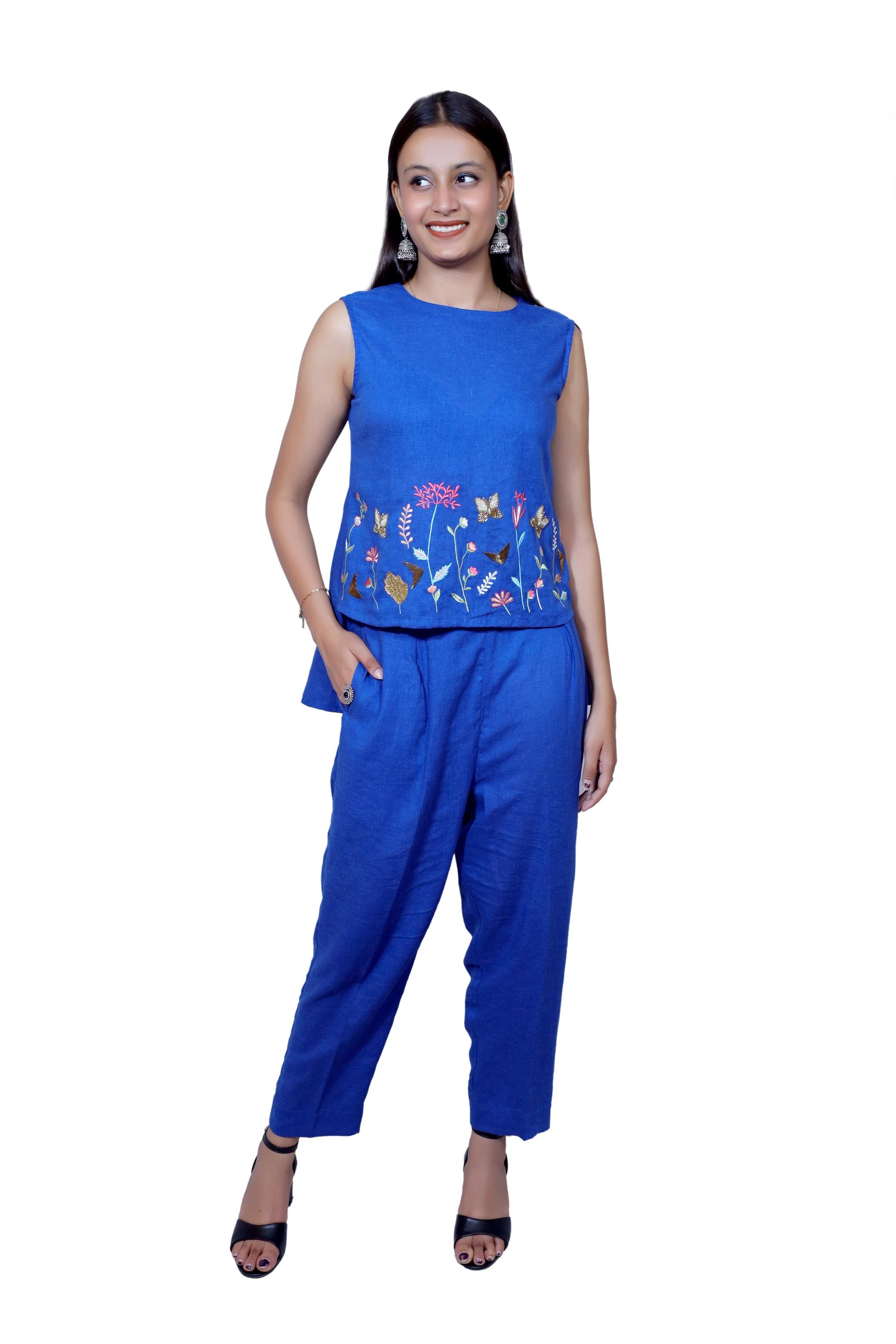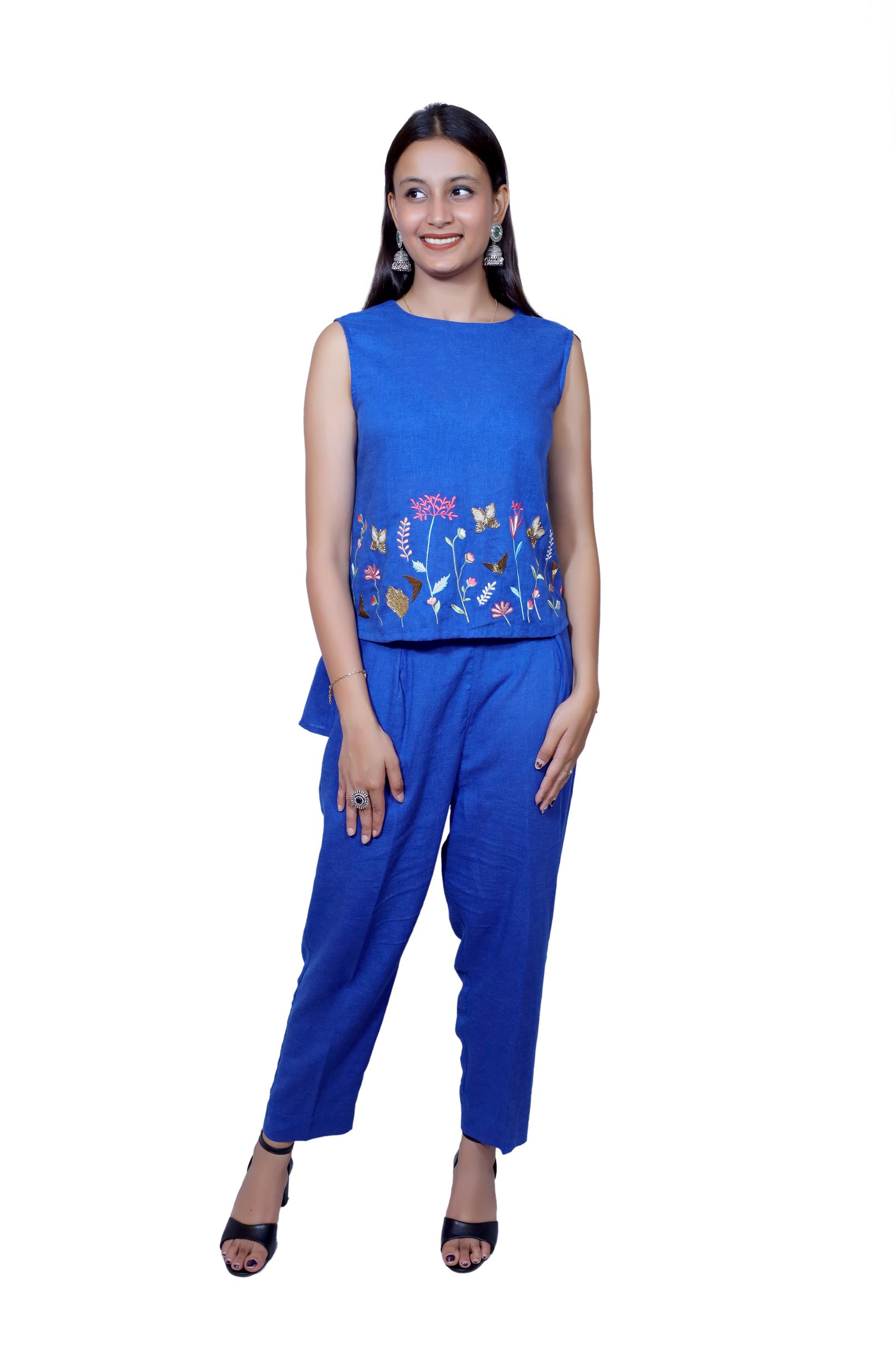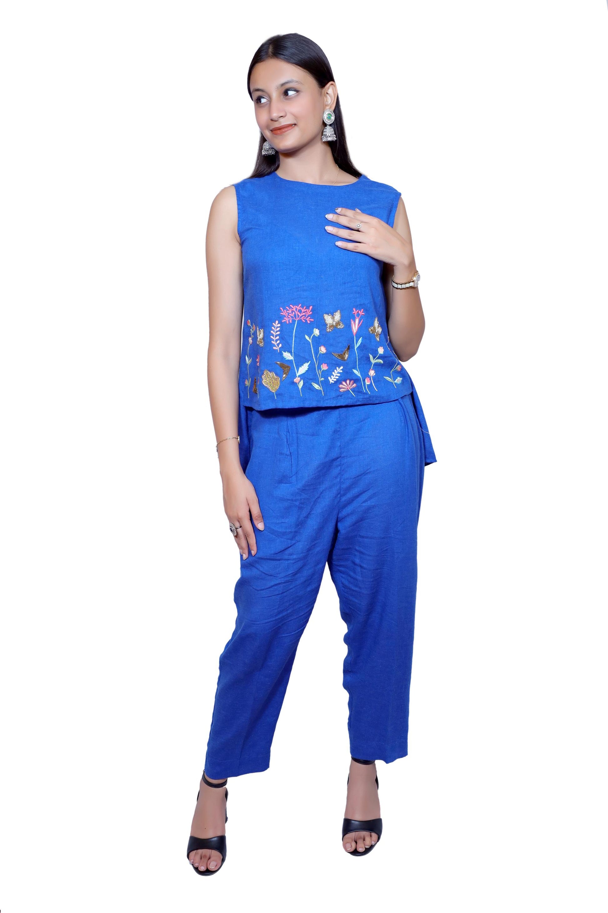 Delicate, vibrant, and effortlessly chic ā the Blue Bloom linen co-ord set is a celebration of nature and handcrafted beauty. This sleeveless top and relaxed pants combo is made from pure, breathable linen in a rich royal blue hue. The highlight is the beautifully hand-embroidered floral and butterfly motifs at the hem of the top, adding a playful yet elegant touch.Key Features:
