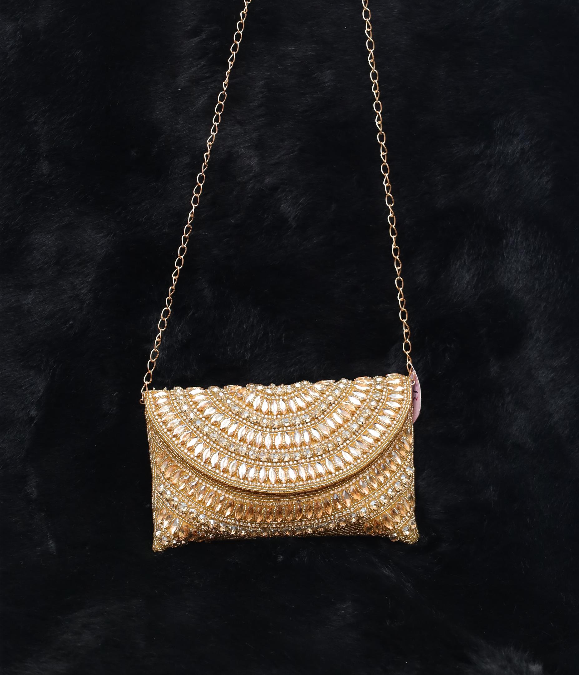 A glamorous golden clutch that exudes elegance with its intricate bead and sequin detailing in a radiant sunburst pattern. Designed to shine at every occasion, this clutch pairs traditional craftsmanship with a chic, modern silhouette.Product Details: