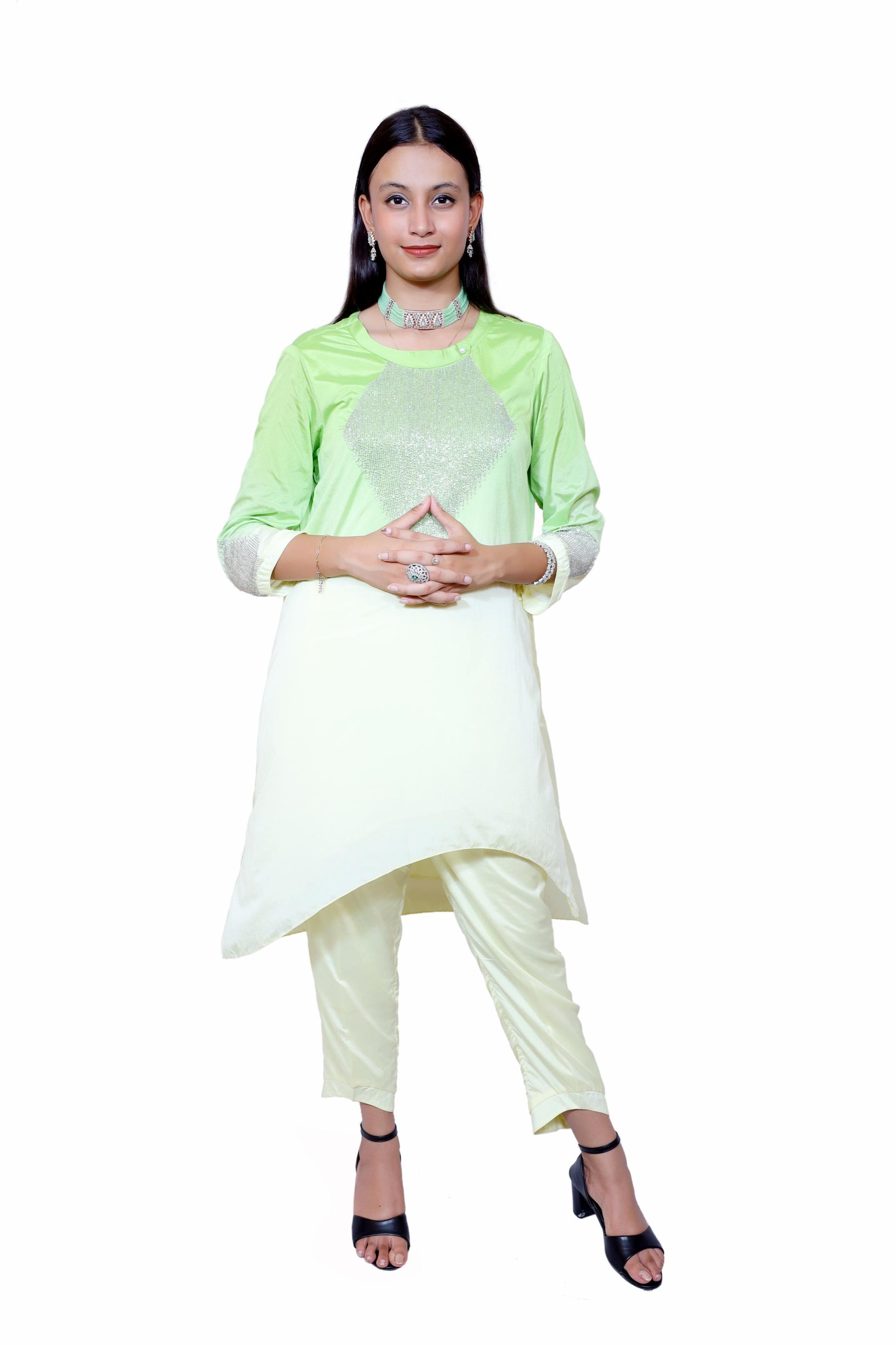 Elevate your festive and evening wardrobe with our Lime Luxe Crepe Co-Ord Set – where elegance meets a refreshing twist of color. Designed in a stunning ombre gradient from fresh lime green to soft lemon yellow, this outfit effortlessly blends contemporary chic with traditional charm.The kurta features a flattering asymmetric hemline and a shimmering diamond-shaped embellished panel at the front, adding a luxe touch to the soft crepe fabric. Embellished sleeve cuffs and a sleek matching bottom complete the look, making it perfect for intimate festivities, family gatherings, or fusion events.Key Features: