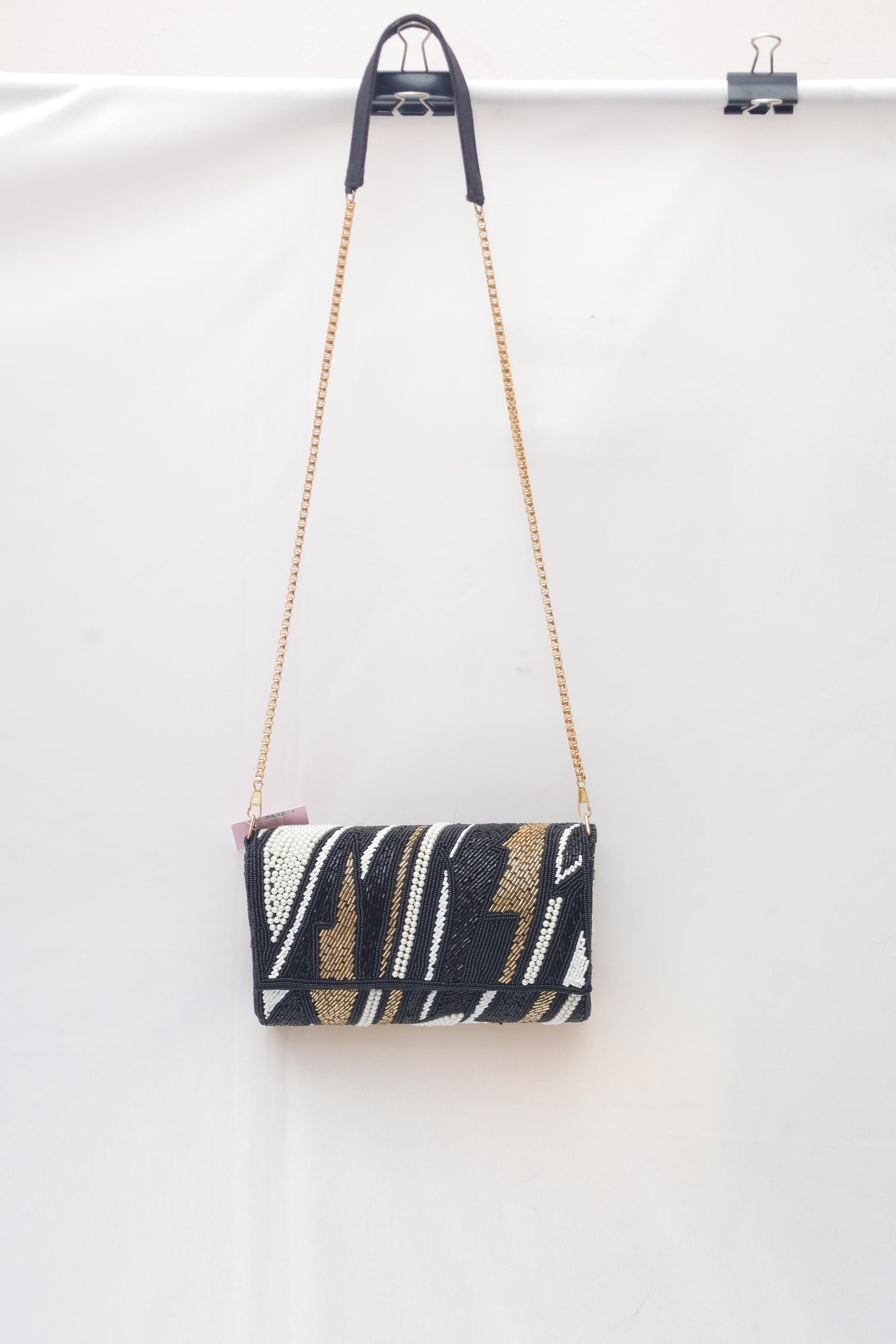 A striking clutch that fuses modern artistry with timeless elegance. Hand-embellished with black, gold, and white beads in bold abstract patterns, this bag is perfect for evenings when you want to make a powerful style statement. Product Details:
