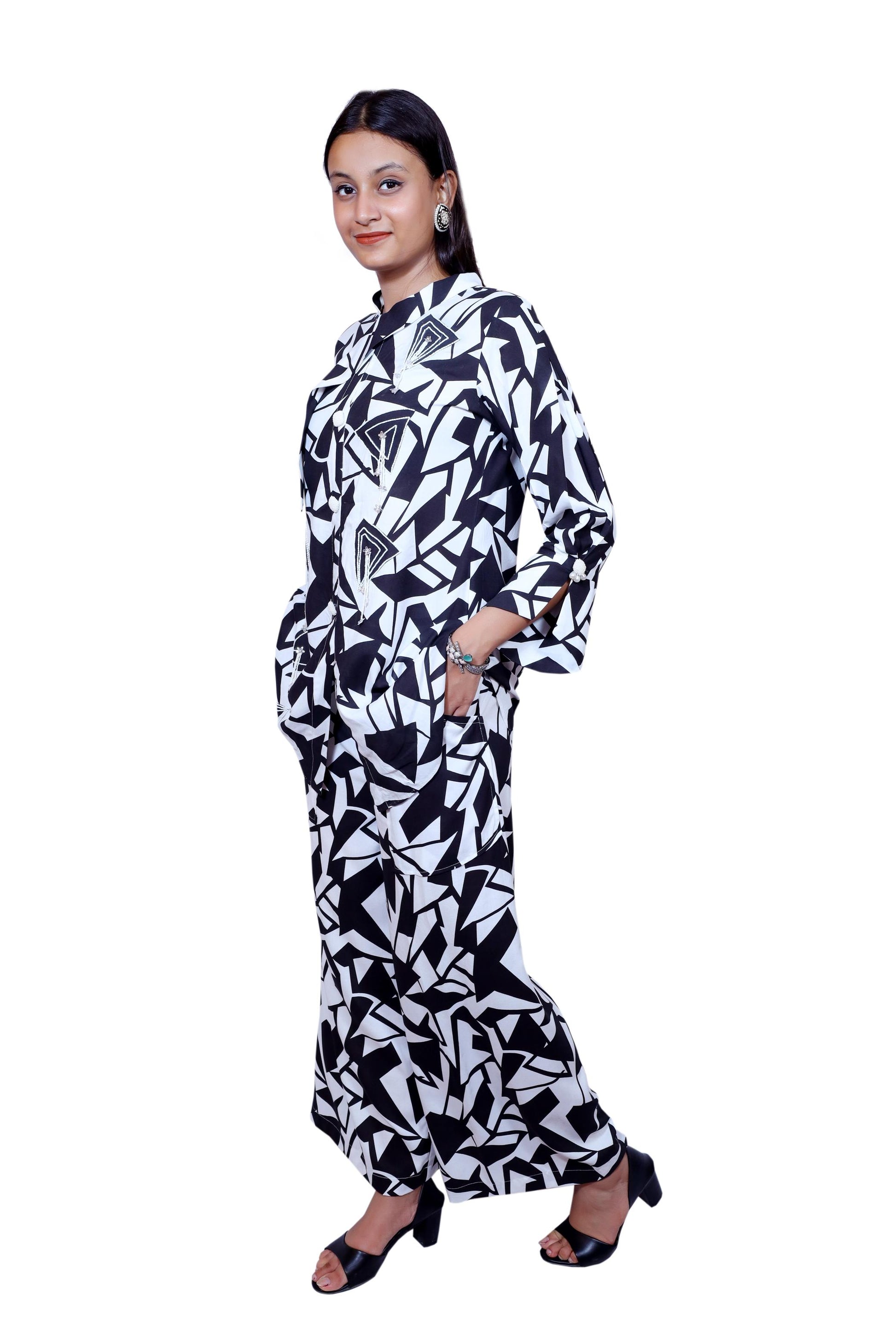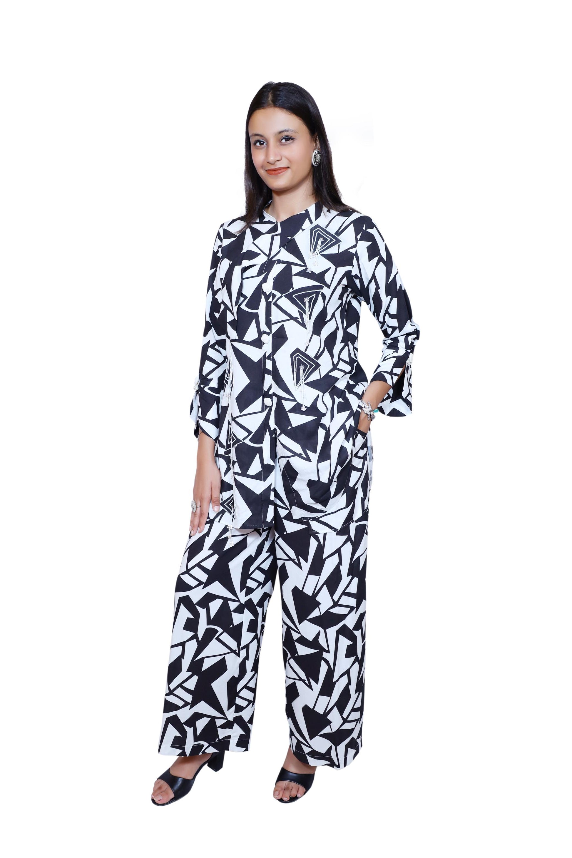 Make a statement with the Monochrome Mirage co-ord set – a bold fusion of geometric design and effortless elegance. Crafted in premium modal cotton, this black and white printed set features a longline button-down shirt with 3/4th sleeves and wide-leg trousers for a structured yet relaxed silhouette.What sets it apart? Subtle yet striking hand embroidery at the collar and sleeves that adds a touch of sophistication to the edgy print.Key Features: