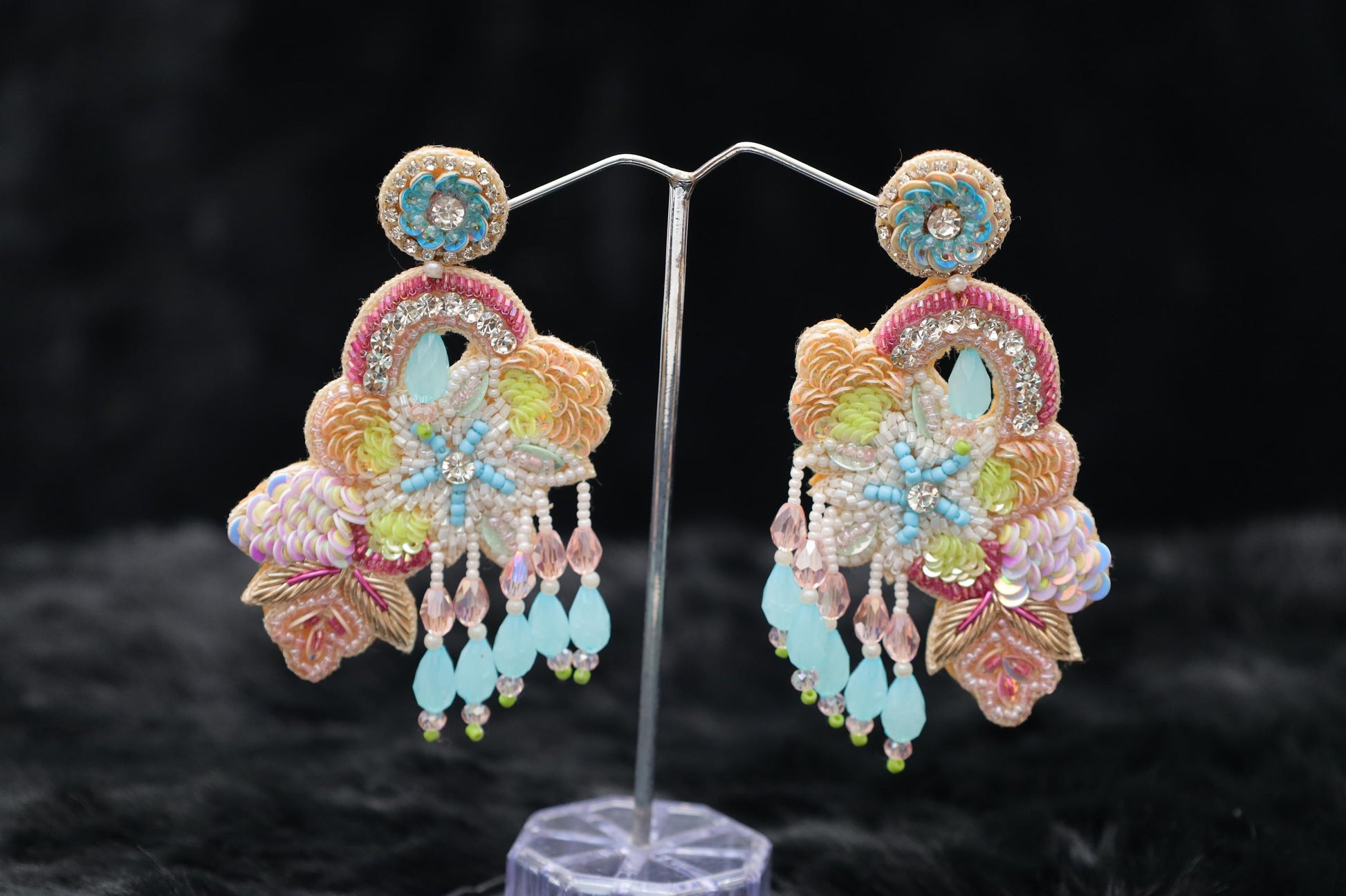 Dangling drops of aqua blue and blush pink beads, giving soft movement and elegance