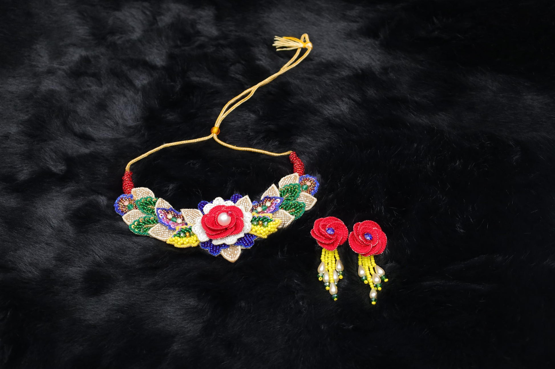 Add a touch of vibrant elegance to your look with the Pearl Blossom jewelry set — a handcrafted masterpiece featuring a bold central red rose with a pearl centerpiece, surrounded by layered petals and multicolored beaded leaves. The lively mix of green, gold, blue, and yellow makes this set stand out, while still maintaining a graceful charm. Paired with matching red rose earrings embellished with yellow and pearl drop beads, this set is ideal for festive celebrations, traditional events, or a unique handmade gift.