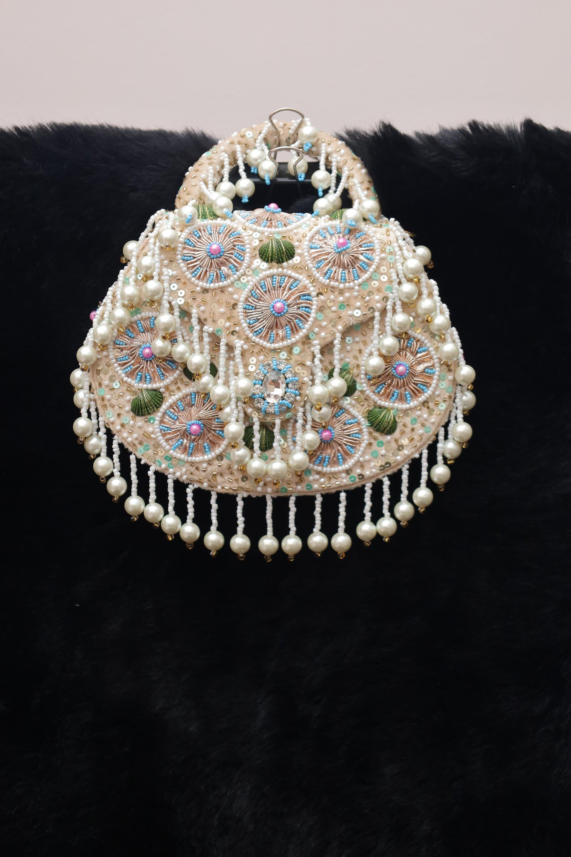 An opulent clutch designed with dazzling beadwork, radiant sequins, and pearl accents. Its rounded silhouette with cascading pearl tassels makes it an exquisite accessory that blends vintage charm with festive glamour. Product Details: