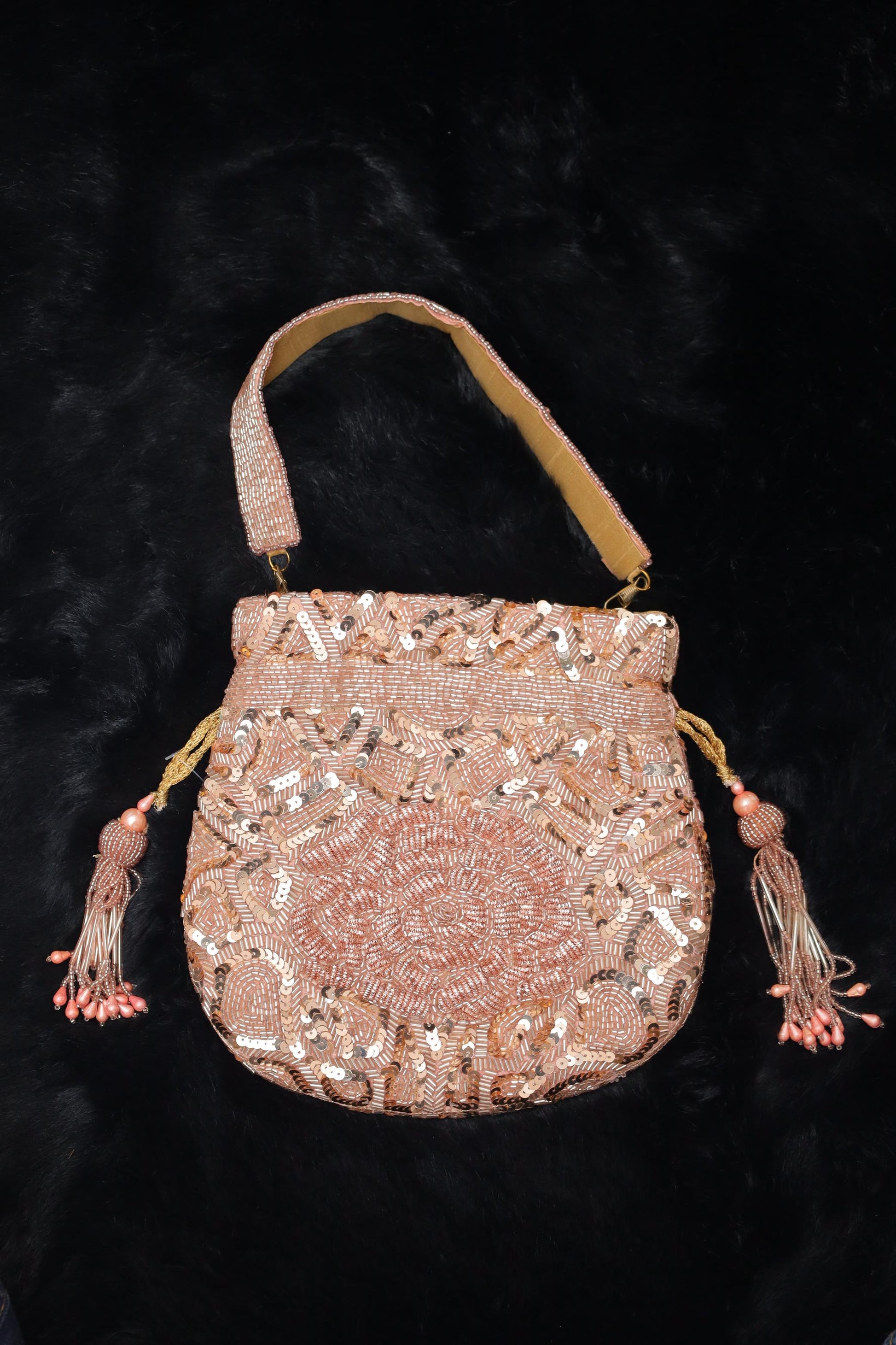 The Rose Gold Sequin Potli is a shimmering handcrafted bag, fully adorned with rose-gold sequins arranged in intricate floral and geometric patterns. Its elegant tone-on-tone design gives it a luxurious, modern charm while still carrying a touch of traditional artistry. Finished with a matching strap and tassel detail, this potli is the perfect statement piece for weddings, receptions, and glamorous evening.Product Details: