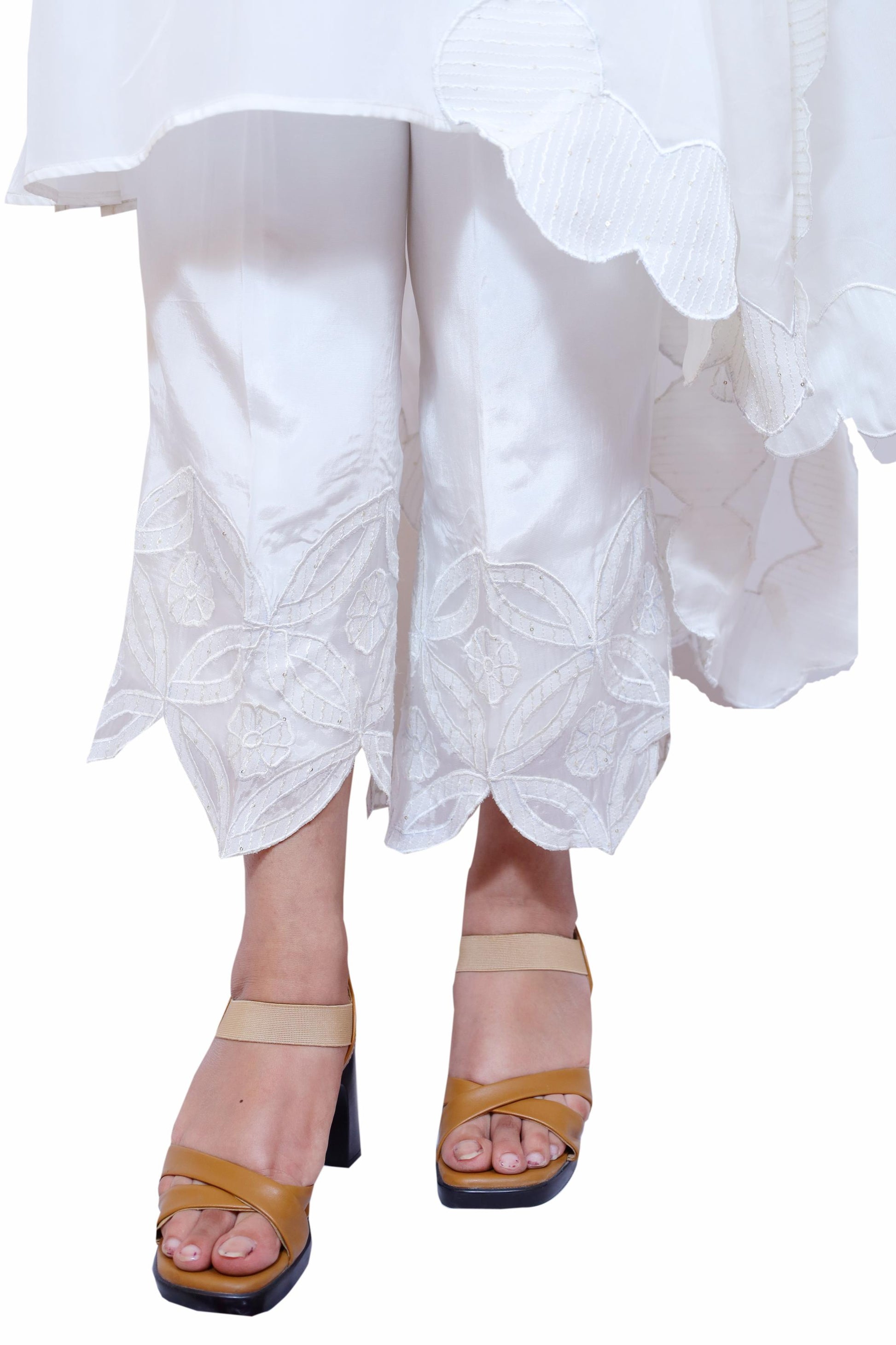Trousers: Intricately embroidered straight pants with floral and leaf cutwork at the hem. The elegant finishing elevates the overall silhouette, making it ideal for both casual and semi-formal events.